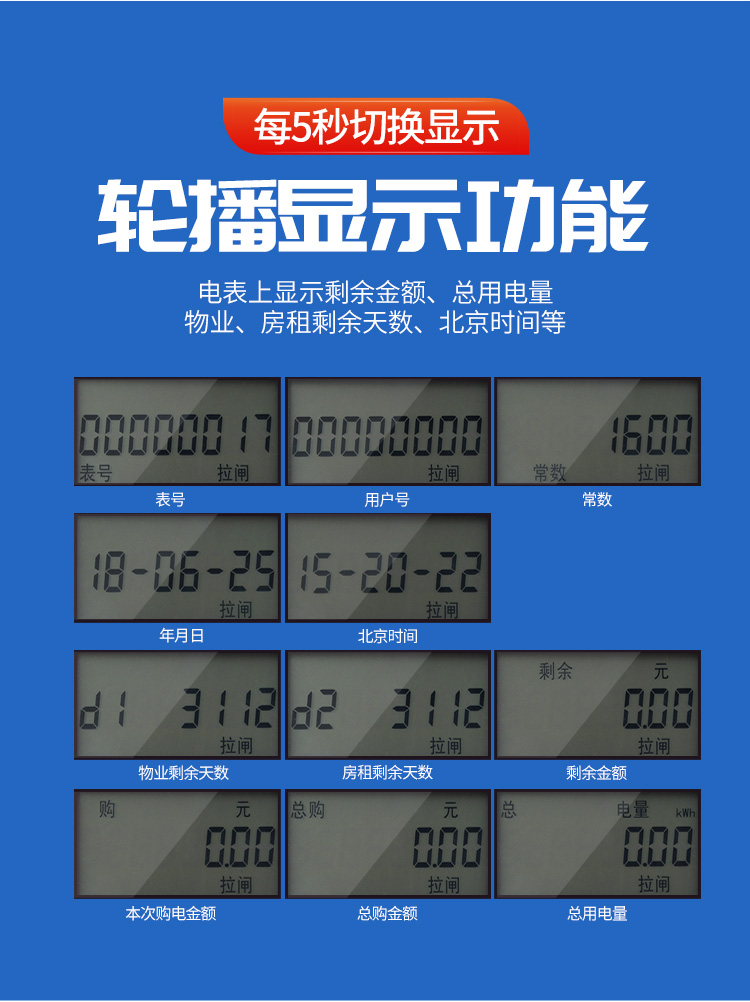 14、 購電提醒:當表內剩余電量小于“報警電量”時,“報警指示燈”將常亮提醒。